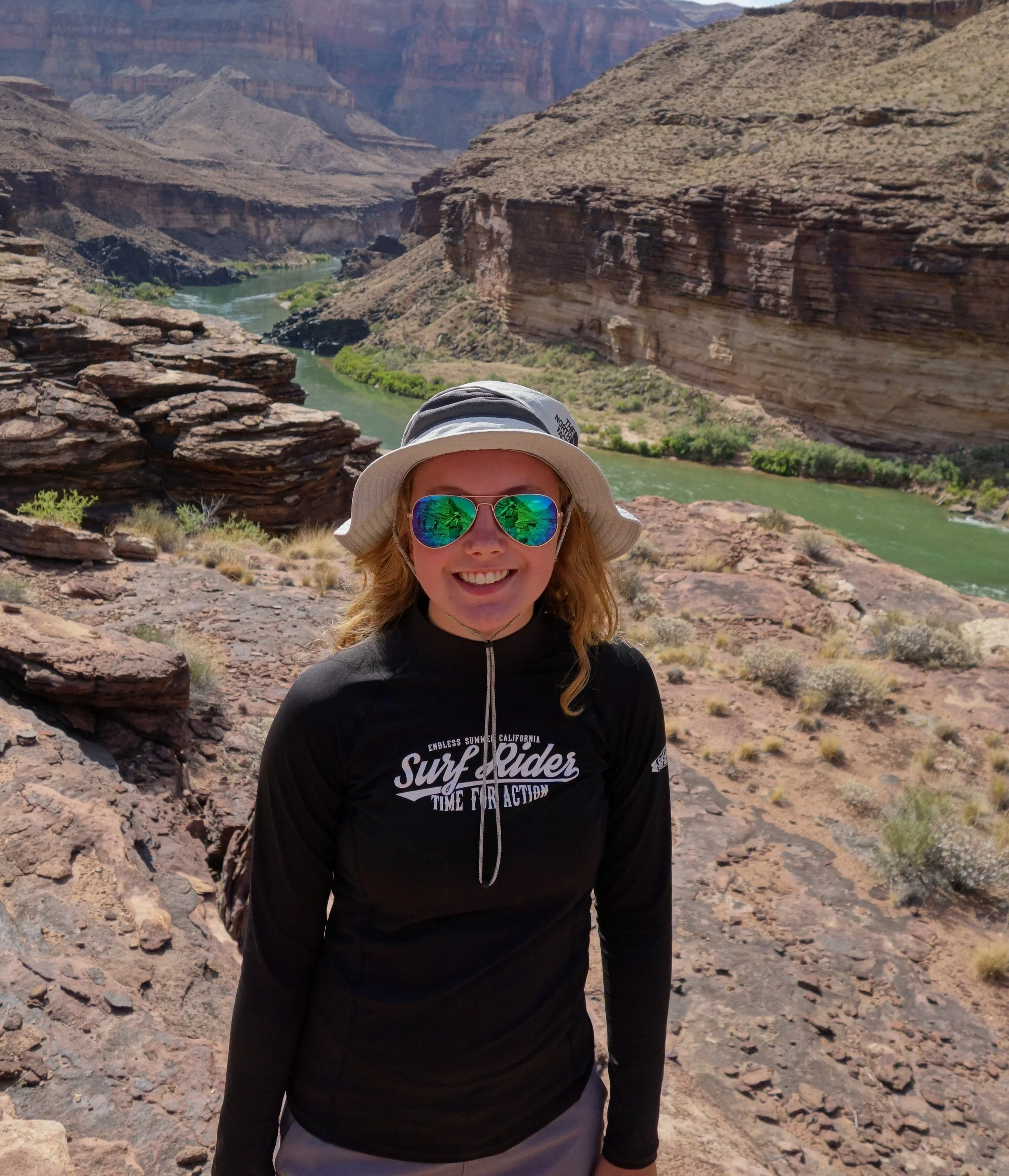 Ok I feel like I can get to the weather about now. The temperature throughout the day, while we were rafting, was about 95-105˚ Fahrenheit (35-40˚C). Now seeing that we were sitting on a rubber raft with no shade, that was really hot. I literally don’t think I had ever been hotter that at some points during this trip. Now I know what you’re thinking, but Emilia, going in the river would cool you down nicely, and considering that you were rafting you should get wet all the time, perfect solution. NOT! I mean, let me do a little bit of explaining. The water in the part of the canyon we were rafting was 45˚ Fahrenheit (7˚C), and if you’re like me, a little wimpy Californian, that’s really cold. So the water didn’t really help the situation on the raft.