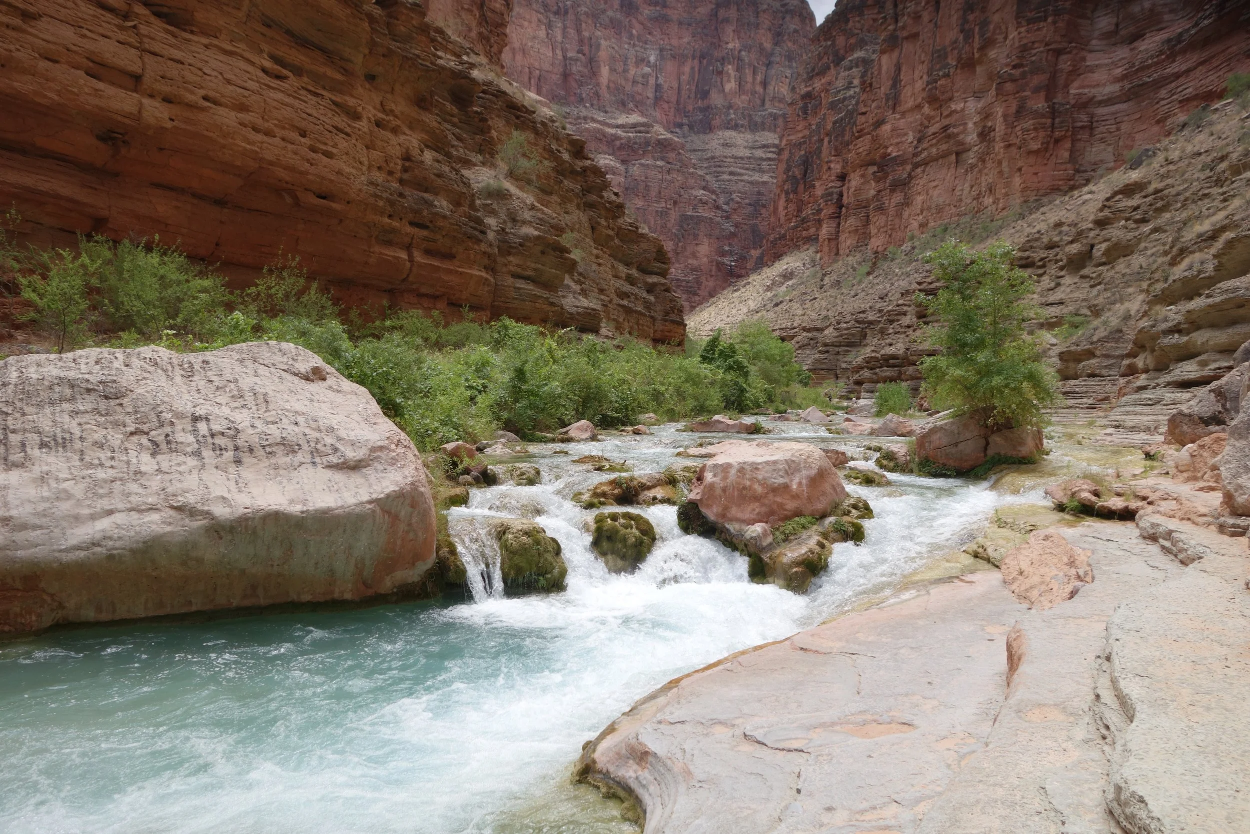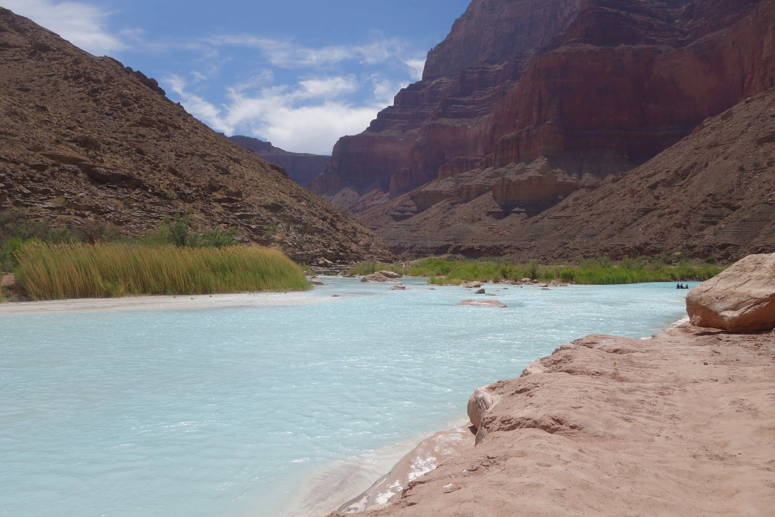 Anyway there were points in the day that we did little hikes to see other cool things in the canyon. During the trip we went to a couple of side rivers. They were much warmer, perfect for swimming, and really pretty. I really enjoyed these little trips because they were relaxing and it was super nice to cool off from the hot weather. The first river we visited, The Little Colorado, looks light blue but is actually white. The blue color comes from the reflection of the sky. It’s white because of the calcium carbonate contained in the water. The other river we visited, Havasu Creek, is one of the prettiest sites of the trip. These rivers were contained in side canyons and provided a nice break from rafting.